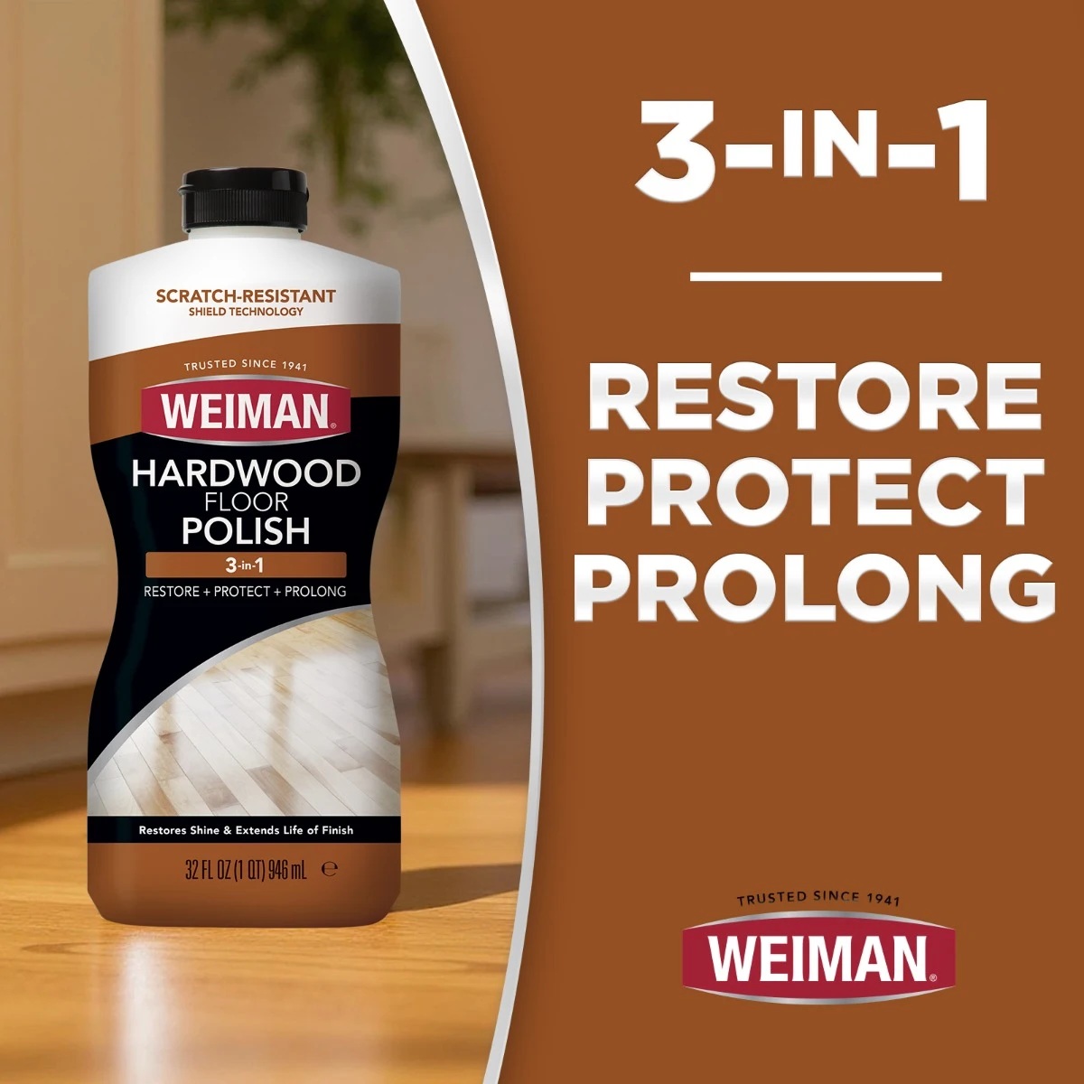 Weiman has been the leading wood care expert in homes since 1941. Weiman Hardwood Floor Polish & Restorer is specially formulated to instantly rejuvenate hardwood floors. Micro-filling technology removes scratches, while a protective, scratch resistant layer prevents new scratches from forming. It leaves a brilliant, natural sheen to hardwood floors with no sticky residue.